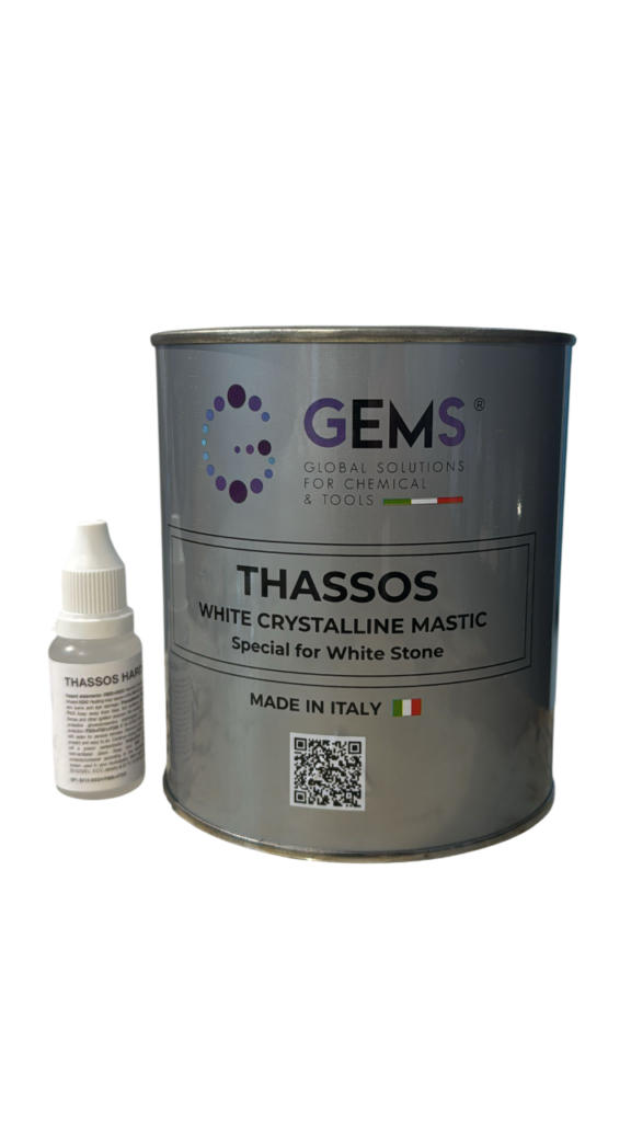 Two-component mastic in thixotropic paste for absorbing white and cristalline marbles such as Thassos, Carrara, Opal White, Volakas, Statuario and Calacatta.
